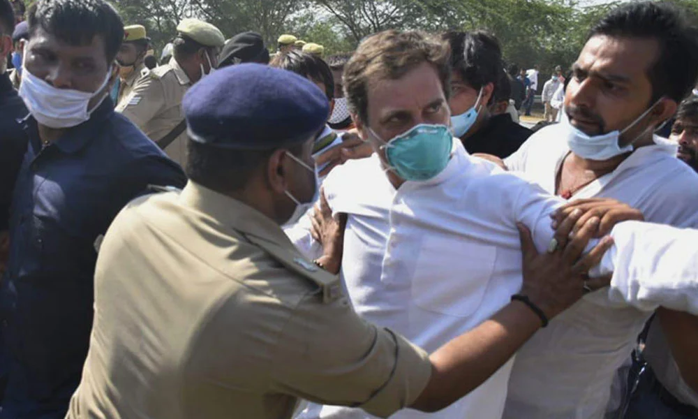 بھارتی ریاست اتر پردیش (یو پی) کی پولیس نے کانگریس رہنما راہول گاندھی کو حراست میں لے لیا۔بھارتی میڈیا کے مطابق راہول گاندھی اپنی بہن پریانکا گاندھی کے ہمراہ جنسی زیادتی کا نشانہ بننے والی متاثرہ لڑکی کے اہل خانہ سے ملنے ہاتھرس جا رہے تھے کہ یمنا ایکسپریس وے پر یو پی پولیس نے انہیں حراست میں لیا۔راہول گاندھی کا کہنا ہے کہ گرفتاری سے قبل یوپی پولیس نے مجھے دھکے دیئے اور لاٹھی چارج کیا، انہوں نے اس موقع پر پولیس کارروائی کی مخالفت کرتے ہوئے پوچھا کہ کس قانون کے تحت انہیں حراست میں لیا جا رہا ہے ۔پولیس کے ساتھ نوک جھونک کے بعد راہول گاندھی غصہ ہو گئے اور انہوں نے میڈیا کے سامنے پولیس پر کئی سوال داغ دئیے ۔راہول گاندھی نے پولیس والوں سے اکیلے جانے دینے کی درخواست کی لیکن پولیس نے ان کی یہ بات نہیں مانی جس پر ان کا کہنا تھا کہ اکیلے آدمی پر دفعہ 144 تو نافذ نہیں ہوتی،راہول گاندھی نے کہا کہ میں پوچھنا چاہتا ہوں کہ کیا اس ملک میں صرف مودی جی کو پیدل چلنے کا حق ہے ، ہمارے جیسے عام لوگ پیدل نہیں چل سکتے ؟ ہماری گاڑیاں روکی گئیں اس لئے ہم پیدل چل رہے ہیں۔