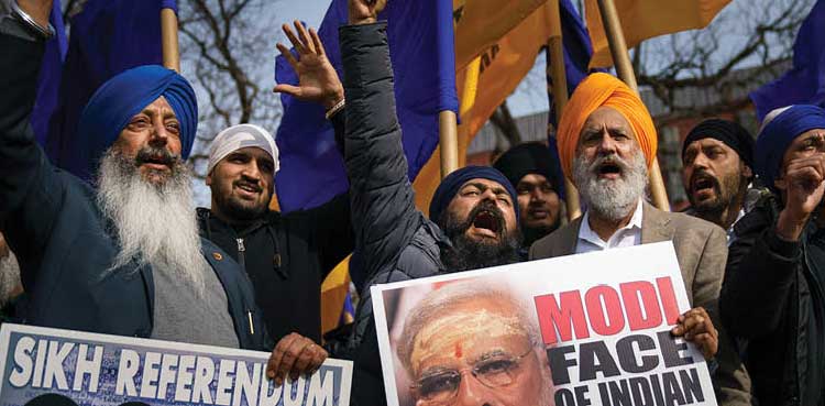 بھارتی وزیر اعظم نریندر مودی نے واشنگٹن آمد پر سکھ مظاہرین نے احتجاج کیا ہے۔بھارتی وزیر اعظم نریندرمودی ولرڈ ہوٹل میں مقیم ہیں جس کے باہر سکھ مظاہرین نے دھرنا دے دیا۔سکھ فار جسٹس کمیونٹی نے ولرڈ ہوٹل کے باہر خالصتان کے پرچم لہرا دیے، مظاہرین نے مودی کے خلاف اور خالصتان کی آزادی کے لیے نعرے بازی بھی کی۔