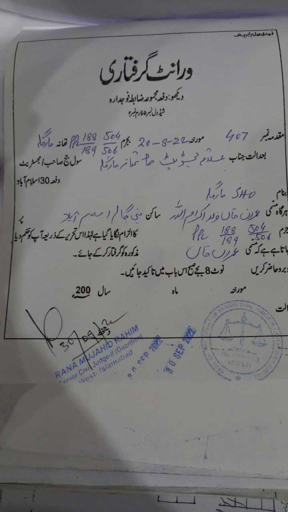 اسلام آباد کے علاقے مارگلہ کے مجسٹریٹ نے خاتون مجسٹریٹ زیبا چوہدری کے خلاف دھمکی آمیز بیان پر درج مقدمے میں پاکستان تحریک انصاف کے چیئرمین عمران خان کے وارنٹ گرفتاری جاری کر دیے۔ اسلام آباد کے تھانہ مارگلہ کے مجسٹریٹ رانا مجاہد رحیم نے 20 اگست کو درج مقدمے میں سابق وزیراعظم عمران خان کے وارنٹ گرفتاری جاری کیے۔