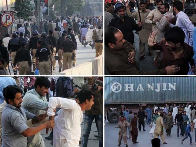 احتجاج کے لیے آنے والے پی ٹی آئی کارکنوں اور پولیس کے درمیان جھڑپیں شروع ہو گئیں، جس سے علاقہ میدان جنگ بن گیا۔ تفصیلات کے مطابق پی ٹی آئی کارکنوں کی جانب سے راولپنڈی میں کمیٹی چوک پر لگے کنٹینرز ہٹا دیے گئے، اس موقع پر کارکن شدید نعرے بازی کر رہے ہیں۔ تحریک انصاف کے کارکنوں کی بڑی تعداد کمیٹی چوک سے لیاقت باغ کی جانب مارچ کر رہی ہے۔ پولیس کی جانب سے کارکنوں کو منتشر کرنے کے لیے شیلنگ کردی گئی، جس کے بعد علاقہ میدان جنگ بن گیا۔ مری روڈ، کمیٹی چوک سے لیاقت باغ کے علاقے میں پولیس اور پی ٹی آئی کارکنوں کے درمیان شدید تصادم جاری ہے، کارکن پولیس پر پتھراؤ کررہے ہیں۔ صورت حال کو دیکھتے ہوئے پولیس کی مزید نفری طلب کرلی گئی ہے۔ پولیس کی جانب سےآنسو گیس کی شیلنگ کا سلسلہ جاری ہے، جس کے شیل قریبی گھروں میں گرے سے خواتین اور بچوں کی حالت غیر ہونے کی اطلاعات ہیں جب کہ میڈیا کے نمائندے بھی شیلنگ کی زد میں آ رہے ہیں۔ کمیٹی چوک میں پولیس اور پی ٹی آئی کارکنوں میں مقابلہ جاری ہے۔ کارکن نعرہ بازی کرتے ہوئے پولیس کی جانب سے فائر کیے ہوئے آنسو گیس کے شیل واپس پولیس پر پھینکے جا رہے ہیں۔ اس دوران راہ گیروں کی بھی حالت غیر ہے۔ مری روڈ کمیٹی چوک سے لیاقت باغ تک صورت حال کشیدہ ہے۔ پی ٹی آئی کارکنوں کی بڑی تعداد نے ریالٹو چوک پر بھی پولیس پر حملہ کیا ہے۔ تحریک انصاف کے کارکن چائنا مارکیٹ ریالٹو چوک کمیٹی چوک سے مری روڈ پر نکل آئے۔ پولیس نے سرکاری گاڑیوں سے خطرے کے سائرن بجانے شروع کر دیے۔ کمیٹی چوک مریڑ چوک چائنا مارکیٹ پر پی ٹی آئی کارکن جمع ہو چکے ہیں جب کہ پولیس ان مقامات سے پسپا ہو گئی ہے۔ پولیس نے کارکنوں کی گرفتاریاں شروع کردی ہیں۔ دوسری جانب چیئرمین پی ٹی آئی بیرسٹر گوہر اور سلمان اکرم راجا کو گرفتار کرلیا گیا ہے۔ دونوں پی ٹی آئی رہنماؤں کو کو ایچ 13 کے پاس سے گرفتار کیا گیا ہے۔ اطلاعات کے مطابق بیرسٹر گوہر اور سلمان اکرم راجا ایچ 13 سے راولپنڈی جا رہے تھے۔ جھڑپوں کے دوران پولیس کی جانب سے آنسو گیس کی شیلنگ کے کچھ دیر بعد ہی شیل ختم ہوگئے، جس پر مزید نفری اور شیل طلب کرلیے گئے ہیں۔ اس موقع پر ڈولفن فورس کی جانب سے بھی کارتوس چلائے جا رہے ہیں جب کہ مری روڈ کمیٹی چوک پر پی ٹی آئی کارکنوں نے پولیس کو پسپا کردیا ہے۔